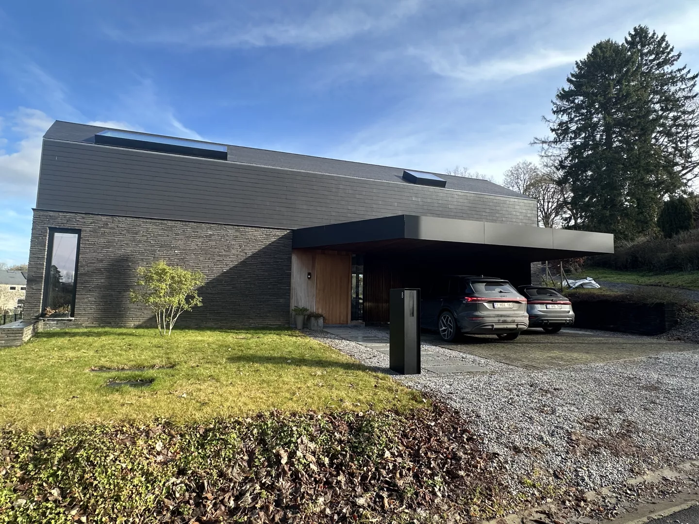 Suivant le cadre dans lequel s’inscrit le projet, la maison s’implante avec un certain recul par rapport à la voirie. Ce choix résulte naturellement de la volonté de minimiser les ombres portées sur les voisins. La parcelle est de forme trapézoïdale avec une largeur à rue plus étroite. Elle est également bordée à droite par un chemin privé et à gauche par un sentier exclusivement piétonnier. De ces contraintes environnementales s’est développé une volumétrie principale trapézoïdale se développant sur 2 niveaux avec un niveau supérieur fortement engagé dans la toiture. Le matériau de façade principal de la construction est une brique de teinte gris rappelant la texture et la couleur des pierres se retrouvant sur la majorité des façades des maisons du village.