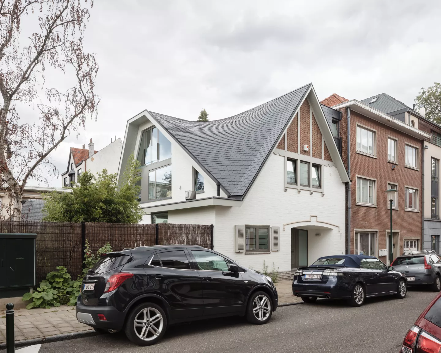 Augmentation de volume d'une maison 3 façades par l'agrandissement des 2 niveaux sous toiture. Pour ce projet, la rehausse de la façade latérale crée une grande lucarne asymétrique, à laquelle le toit se raccorde par une structure courbe en forme de paraboloïde. Tout l'intérieur est réaménagé dans un style contemporain faisant écho à l'architecture fifties de la maison.